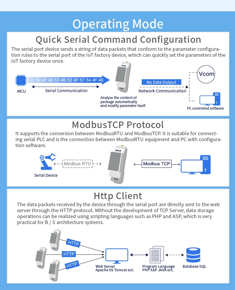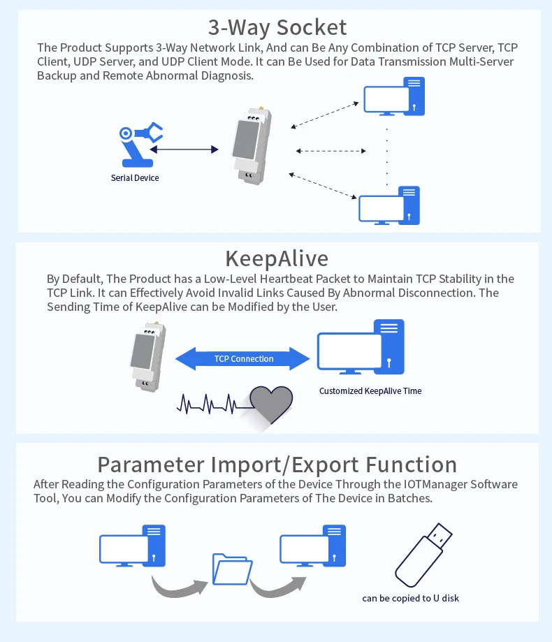 | Configuration | Web CLI XML import Telnet IOTService PC Software |